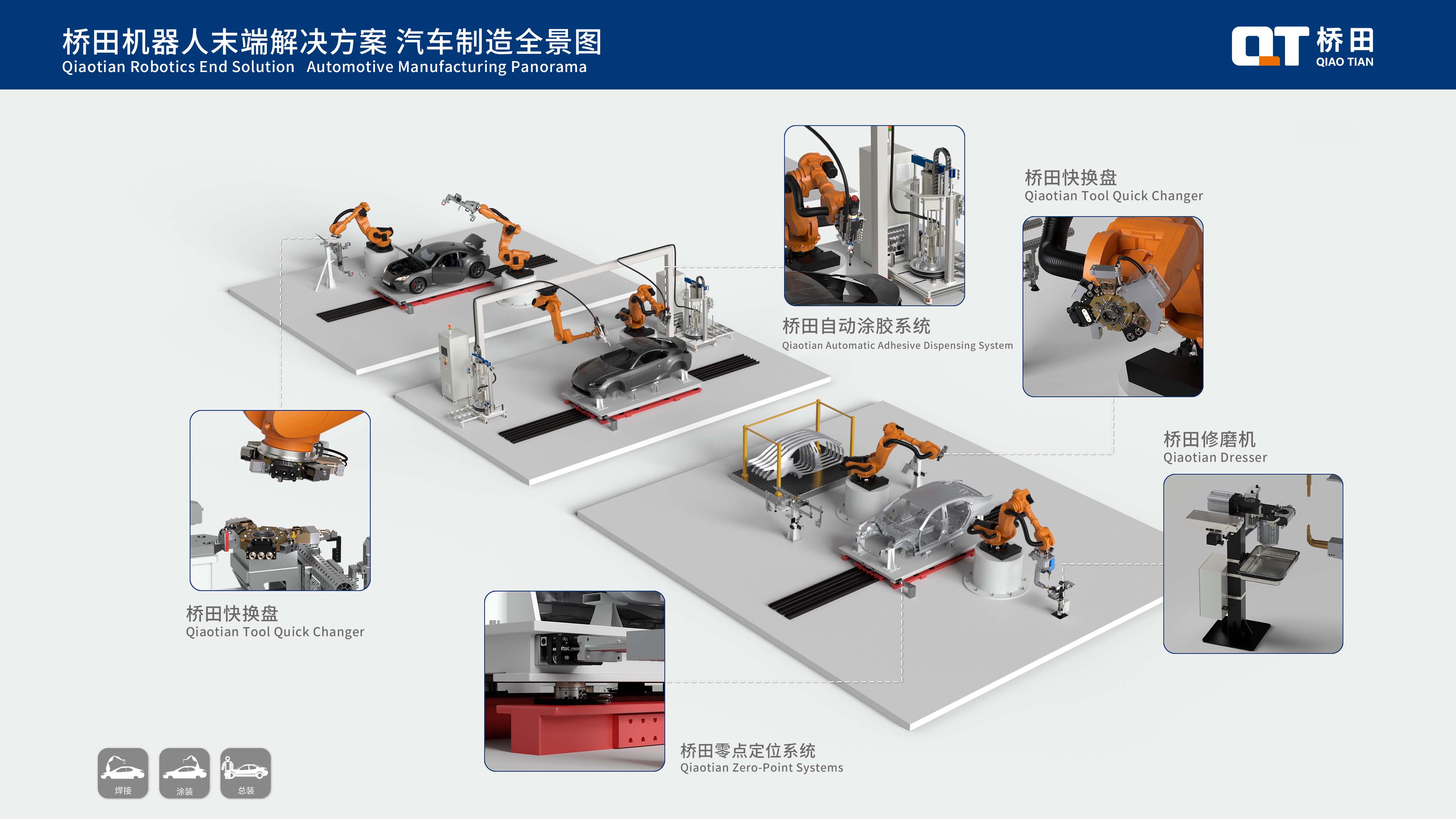 據(jù)了解,橋田智能的核心產(chǎn)品機(jī)器人末端快換裝置自2020年起已陸續(xù)進(jìn)入主流主機(jī)廠供應(yīng)鏈,并通過TüV、VDA6.4、CE、ISO等多項(xiàng)行業(yè)權(quán)威認(rèn)證,奠定了其技術(shù)合規(guī)性與市場認(rèn)可度。目前公司已形成三大核心產(chǎn)品線:白車身裝配和焊接機(jī)器人末端解決方案、高頻快速換模與工業(yè)連接器、三電領(lǐng)域精密裝配系統(tǒng),具體涵蓋快換盤、抓取系統(tǒng)、修磨機(jī)、磁力換模系統(tǒng)等關(guān)鍵設(shè)備,全面覆蓋智能制造末端執(zhí)行場景。
